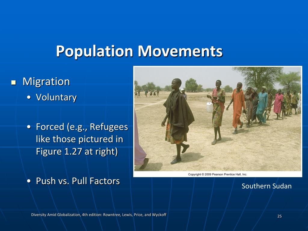 Population Movements • Migration • Voluntary • Forced (e.g., Refugees like those pictured in Figure 1.27 at right) • Push vs. Pull Factors Southern Sudan Diversity Amid Globalization, 4th edition: Rowntree, Lewis, Price, and Wyckoff