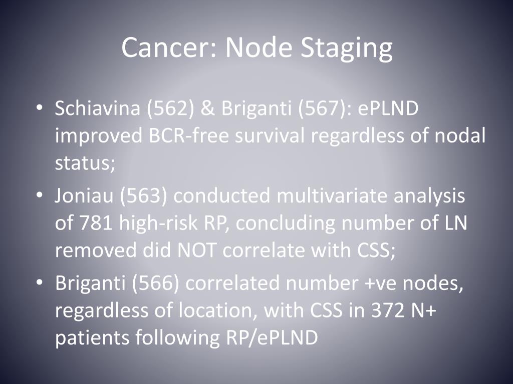 Cancer: Node Staging • Schiavina (562) & Briganti (567): ePLND improved BCR-free survival regardless of nodal status; • Joniau (563) conducted multivariate analysis of 781 high-risk RP, concluding number of LN removed did NOT correlate with CSS; • Briganti (566) correlated number +ve nodes, regardless of location, with CSS in 372 N+ patients following RP/ePLND