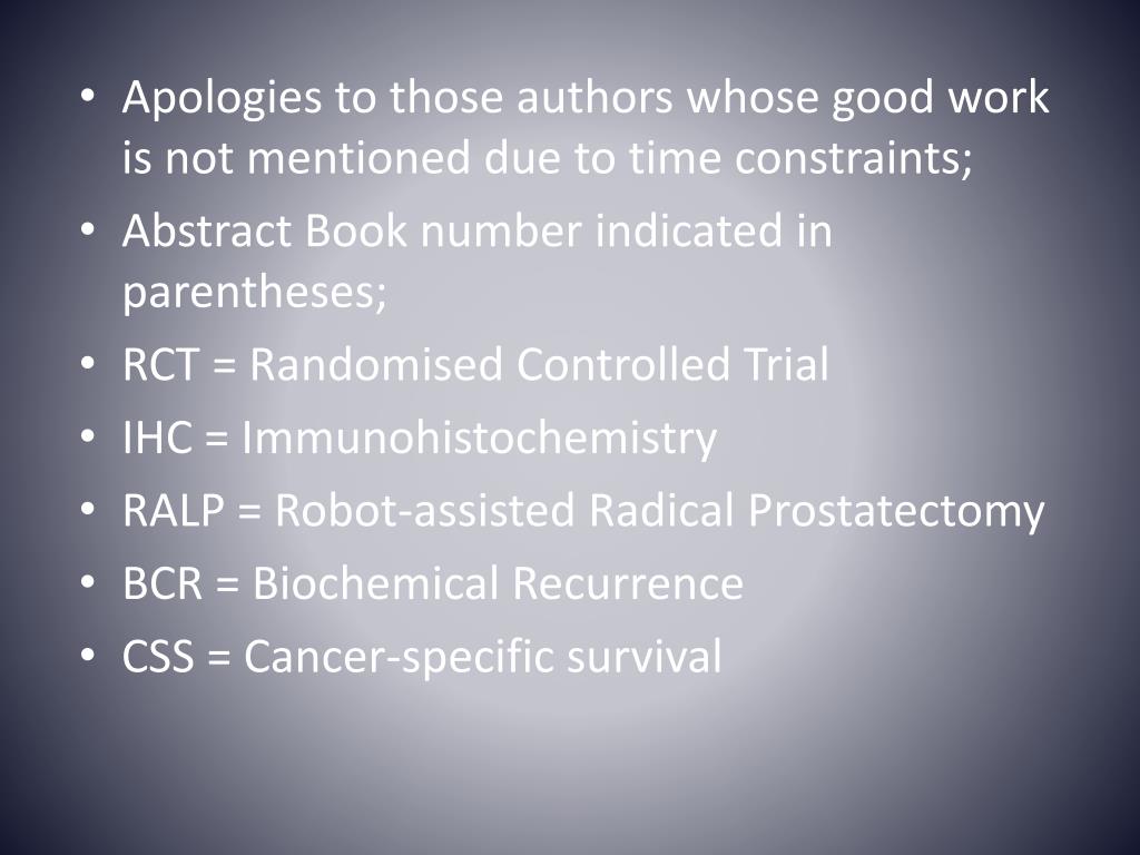 Apologies to those authors whose good work is not mentioned due to time constraints; • Abstract Book number indicated in parentheses; • RCT = Randomised Controlled Trial • IHC = Immunohistochemistry • RALP = Robot-assisted Radical Prostatectomy • BCR = Biochemical Recurrence • CSS = Cancer-specific survival
