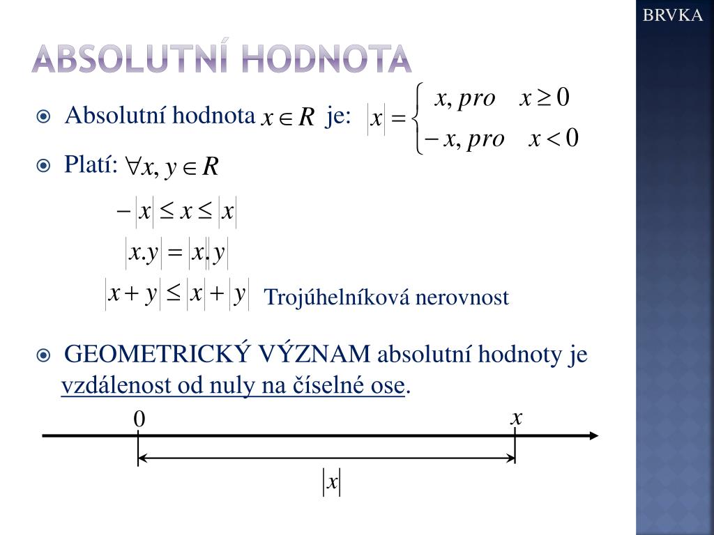 BRVKA 0 Absolutní hodnota • Absolutní hodnota je: • Platí: Trojúhelníková nerovnost • GEOMETRICKÝ VÝZNAM absolutní hodnoty je • vzdálenost od nuly na číselné ose.