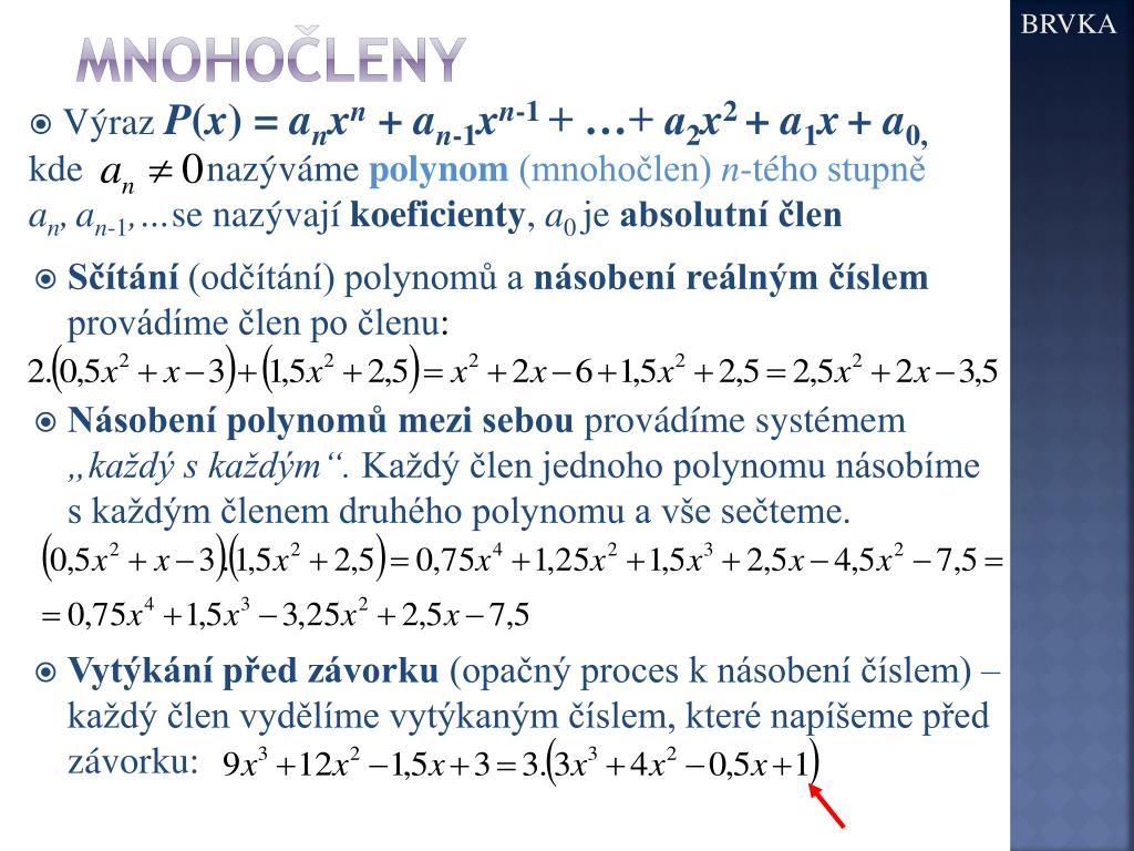 BRVKA mnohočleny • Výraz P(x) = anxn + an-1xn-1+ …+ a2x2+ a1x+ a0, kde nazýváme polynom (mnohočlen) n-tého stupně an,an-1,…se nazývají koeficienty, a0 je absolutní člen • Sčítání (odčítání) polynomů a násobení reálným číslem provádíme člen po členu: • Násobení polynomů mezi sebou provádíme systémem „každý s každým“. Každý člen jednoho polynomu násobíme s každým členem druhého polynomu a vše sečteme. • Vytýkání před závorku (opačný proces k násobení číslem) – každý člen vydělíme vytýkaným číslem, které napíšeme před závorku: