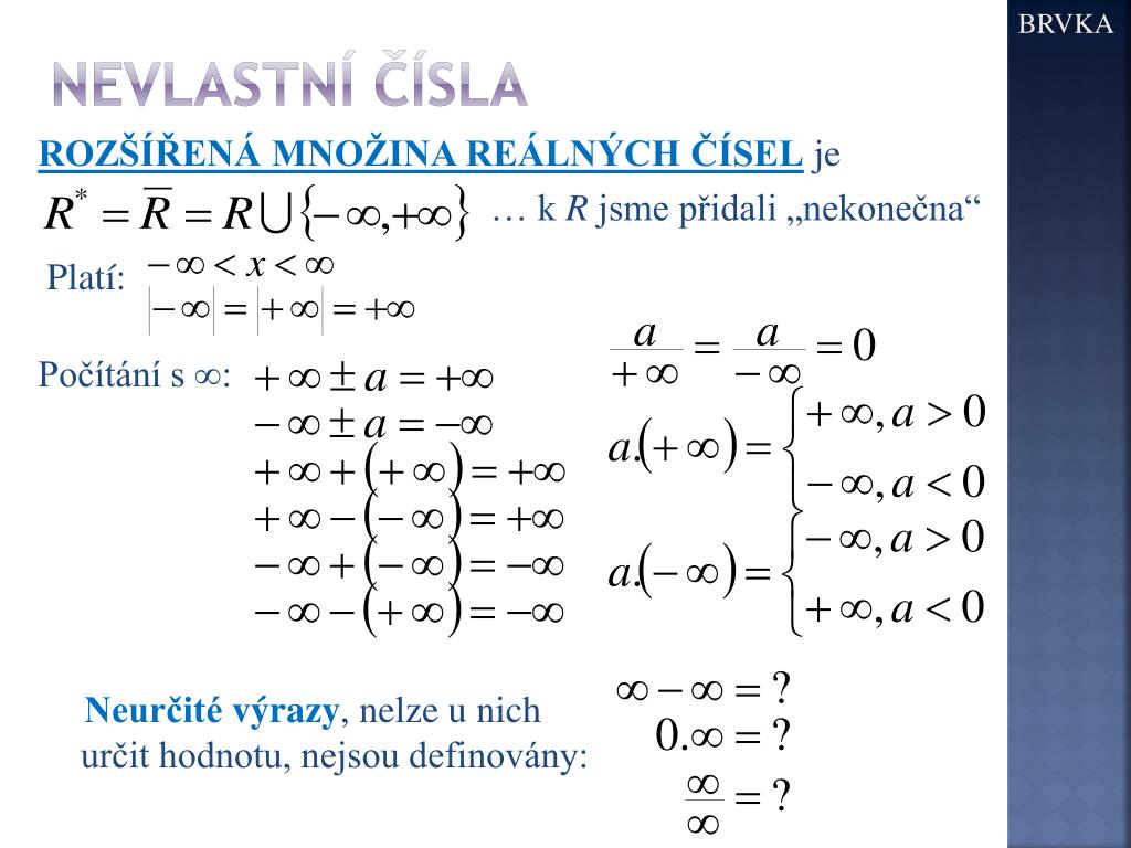 BRVKA Nevlastní čísla ROZŠÍŘENÁ MNOŽINA REÁLNÝCH ČÍSEL je … k R jsme přidali „nekonečna“ Platí: Počítání s ∞: Neurčitévýrazy, nelze u nich určit hodnotu, nejsou definovány:
