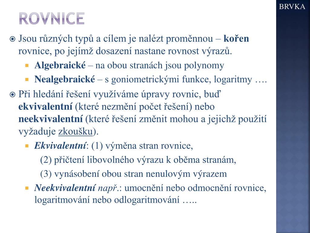 BRVKA rovnice • Jsou různých typů a cílem je nalézt proměnnou – kořen rovnice, po jejímž dosazení nastane rovnost výrazů. • Algebraické – na obou stranách jsou polynomy • Nealgebraické – s goniometrickými funkce, logaritmy …. • Při hledání řešení využíváme úpravy rovnic, buď ekvivalentní (které nezmění počet řešení) nebo neekvivalentní (které řešení změnit mohou a jejichž použití vyžaduje zkoušku). • Ekvivalentní: (1) výměna stran rovnice, (2) přičtení libovolného výrazu k oběma stranám, (3) vynásobení obou stran nenulovým výrazem • Neekvivalentnínapř.: umocnění nebo odmocnění rovnice, logaritmování nebo odlogaritmování …..