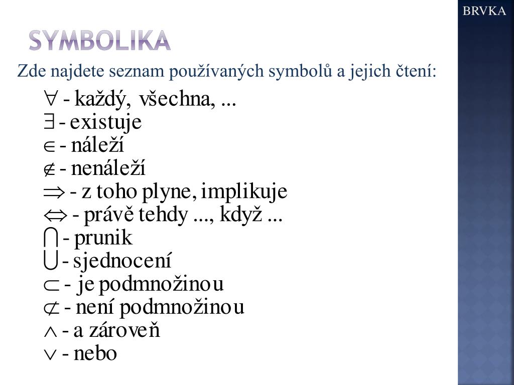 BRVKA. 1.přednáška úvod do matematiky. Bernard Bolzano (1781-1848). BRVKA. symbolika. Zde najdete seznam používaných symbolů a jejich čtení:. BRVKA. množiny.