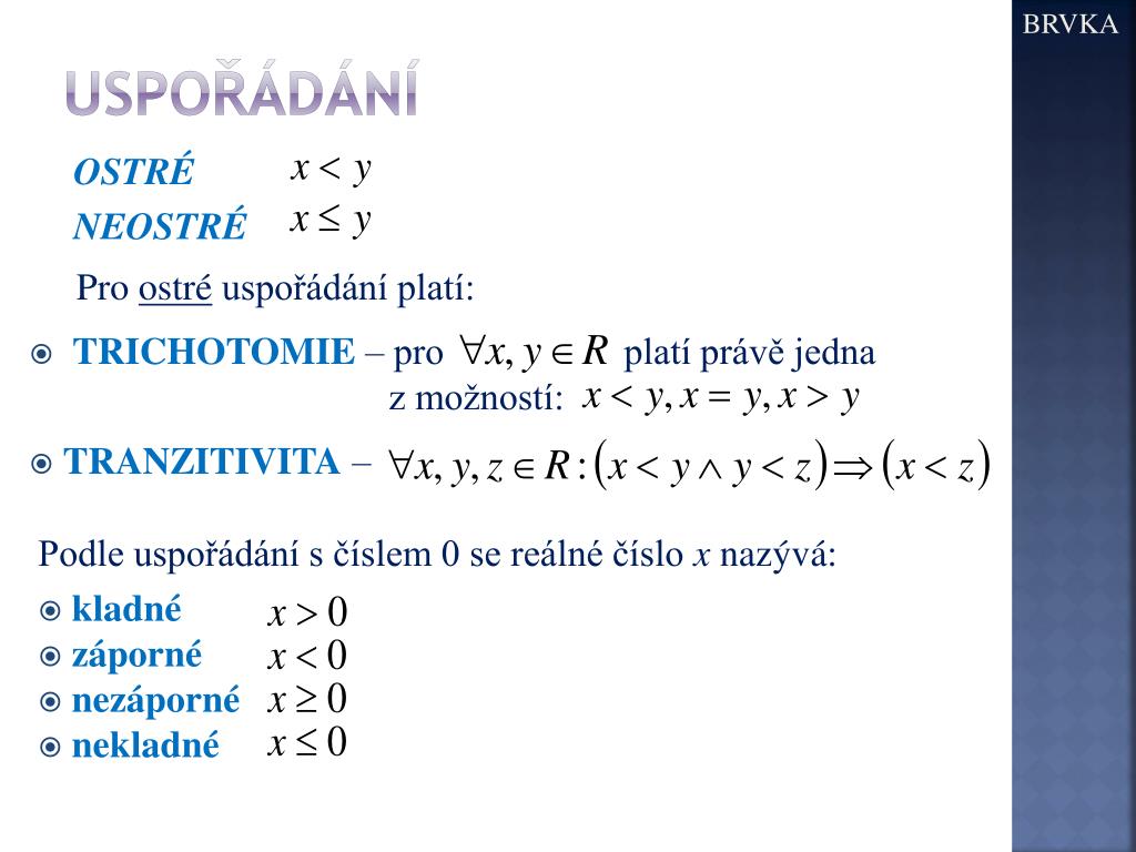 BRVKA uspořádání OSTRÉ NEOSTRÉ • Pro ostré uspořádání platí: • TRICHOTOMIE – pro platí právě jedna • z možností: • TRANZITIVITA – • Podle uspořádání s číslem 0 se reálné číslo x nazývá: • kladné • záporné • nezáporné • nekladné
