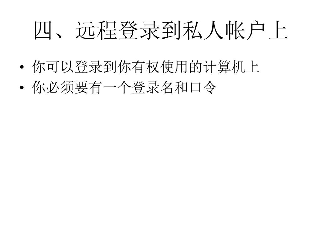 四、远程登录到私人帐户上 • 你可以登录到你有权使用的计算机上 • 你必须要有一个登录名和口令
