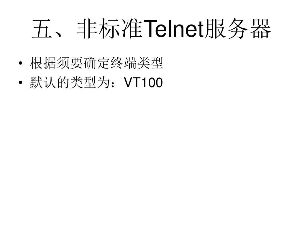五、非标准Telnet服务器 • 根据须要确定终端类型 • 默认的类型为:VT100