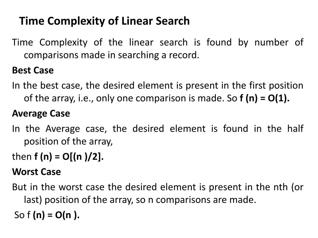Time Complexity of Linear Search Time Complexity of the linear search is found by number of comparisons made in searching a record. Best Case In the best case, the desired element is present in the first position of the array, i.e., only one comparison is made. So f (n) = O(1). Average Case In the Average case, the desired element is found in the half position of the array, then f (n) = O[(n )/2]. Worst Case But in the worst case the desired element is present in the nth (or last) position of the array, so n comparisons are made. So f (n) = O(n ).