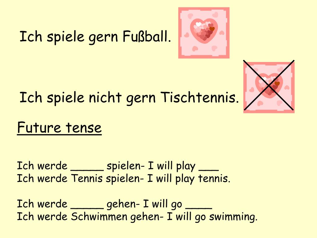 Future tenseIch werde _____ spielen- I will play ___Ich werde Tennis spielen- I will play tennis.Ich werde _____ gehen- I will go ____Ich werde Schwimmen gehen- I will go swimming. Ich spiele gern Fußball. Ich spiele nicht gern Tischtennis.