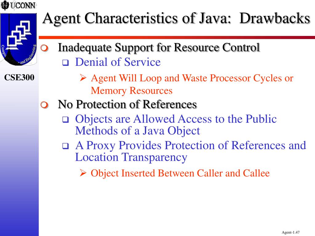 Agent Characteristics of Java: Drawbacks • Inadequate Support for Resource Control • Denial of Service • Agent Will Loop and Waste Processor Cycles or Memory Resources • No Protection of References • Objects are Allowed Access to the Public Methods of a Java Object • A Proxy Provides Protection of References and Location Transparency • Object Inserted Between Caller and Callee