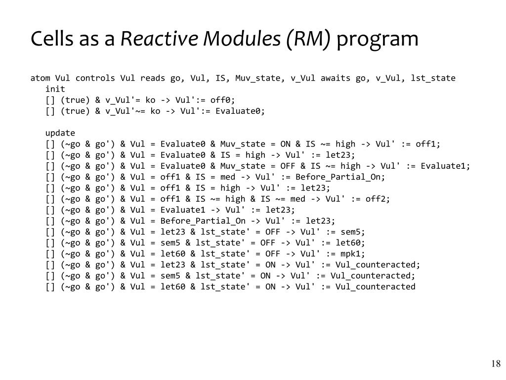 Cells as a Reactive Modules (RM) program atom Vul controls Vul reads go, Vul, IS, Muv_state, v_Vul awaits go, v_Vul, lst_state init [] (true) & v_Vul'= ko -> Vul':= off0; [] (true) & v_Vul'~= ko -> Vul':= Evaluate0; update [] (~go & go') & Vul = Evaluate0 & Muv_state = ON & IS ~= high -> Vul' := off1; [] (~go & go') & Vul = Evaluate0 & IS = high -> Vul' := let23; [] (~go & go') & Vul = Evaluate0 & Muv_state = OFF & IS ~= high -> Vul' := Evaluate1; [] (~go & go') & Vul = off1 & IS = med -> Vul' := Before_Partial_On; [] (~go & go') & Vul = off1 & IS = high -> Vul' := let23; [] (~go & go') & Vul = off1 & IS ~= high & IS ~= med -> Vul' := off2; [] (~go & go') & Vul = Evaluate1 -> Vul' := let23; [] (~go & go') & Vul = Before_Partial_On -> Vul' := let23; [] (~go & go') & Vul = let23 & lst_state' = OFF -> Vul' := sem5; [] (~go & go') & Vul = sem5 & lst_state' = OFF -> Vul' := let60; [] (~go & go') & Vul = let60 & lst_state' = OFF -> Vul' := mpk1; [] (~go & go') & Vul = let23 & lst_state' = ON -> Vul' := Vul_counteracted; [] (~go & go') & Vul = sem5 & lst_state' = ON -> Vul' := Vul_counteracted; [] (~go & go') & Vul = let60 & lst_state' = ON -> Vul' := Vul_counteracted