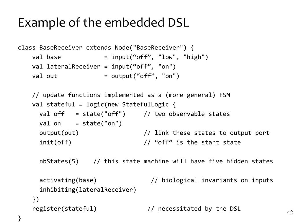 Example of the embedded DSL class BaseReceiver extends Node("BaseReceiver") { val base = input(“off”, "low", "high") vallateralReceiver = input(“off”, "on") val out = output(“off”, "on") // update functions implemented as a (more general) FSM valstateful = logic(new StatefulLogic{ val off = state("off") // two observable states val on = state("on") output(out) // link these states to output port init(off) // “off” is the start state nbStates(5) // this state machine will have five hidden states activating(base) // biological invariants on inputs inhibiting(lateralReceiver) }) register(stateful) // necessitated by the DSL }