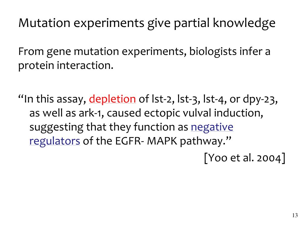 Mutation experiments give partial knowledge From gene mutation experiments, biologists infer a protein interaction. “In this assay, depletionof lst-2, lst-3, lst-4, or dpy-23, as well as ark-1, caused ectopic vulval induction, suggesting that they function as negative regulators of the EGFR- MAPK pathway.” [Yoo et al. 2004]