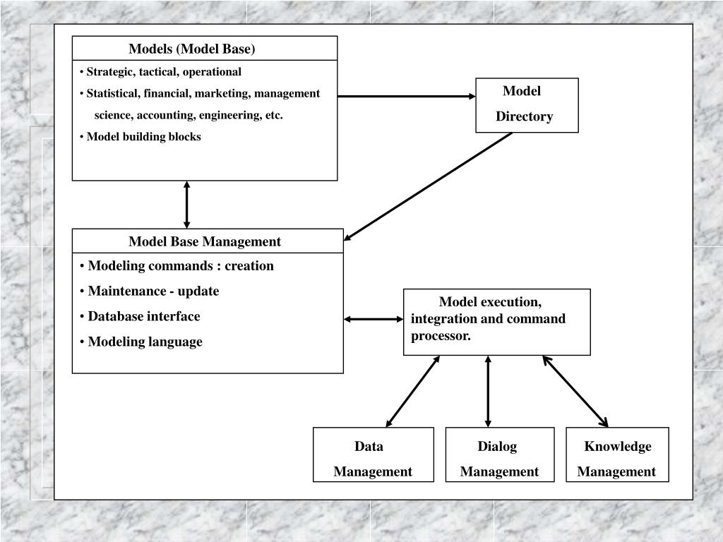 Models (Model Base) • Strategic, tactical, operational • Statistical, financial, marketing, management • science, accounting, engineering, etc. • Model building blocks Model Directory Model Base Management • Modeling commands : creation • Maintenance - update • Database interface • Modeling language Model execution, integration and command processor. Data Management Dialog Management Knowledge Management