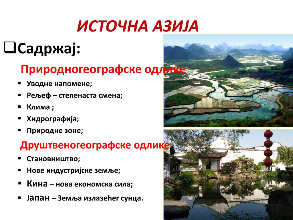 ИСТОЧНА АЗИЈА • Садржај: Природногеографске одлике • Уводне напомене; • Рељеф – степенаста смена; • Клима ; • Хидрографија; • Природне зоне; Друштвеногеографске одлике • Становништво; • Нове индустријске земље; • Кина – нова економска сила; • Јапан – Земља излазећег сунца.