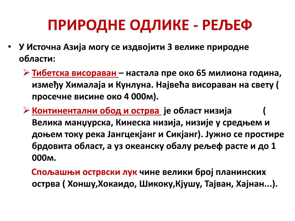 ПРИРОДНЕ ОДЛИКЕ - РЕЉЕФ • У Источна Азија могу се издвојити 3 велике природне области: • Тибетска висораван – настала пре око 65 милиона година, између Хималаја и Кунлуна. Највећа висораван на свету ( просечне висине око 4 000м). • Континентални обод и острва је област низија ( Велика манџурска, Кинеска низија, низије у средњем и доњем току река Јангцекјанг и Сикјанг). Јужно се простире брдовита област, а уз океанску обалу рељеф расте и до 1 000м. Спољашњи острвски лук чине велики број планинских острва ( Хоншу,Хокаидо, Шикоку,Кјушу, Тајван, Хајнан...).
