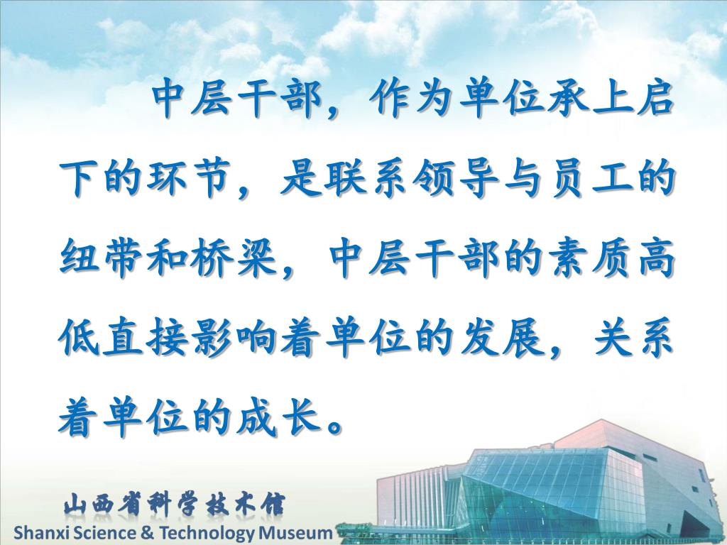 中层干部,作为单位承上启下的环节,是联系领导与员工的纽带和桥梁,中层干部的素质高低直接影响着单位的发展,关系着单位的成长。中层干部,作为单位承上启下的环节,是联系领导与员工的纽带和桥梁,中层干部的素质高低直接影响着单位的发展,关系着单位的成长。