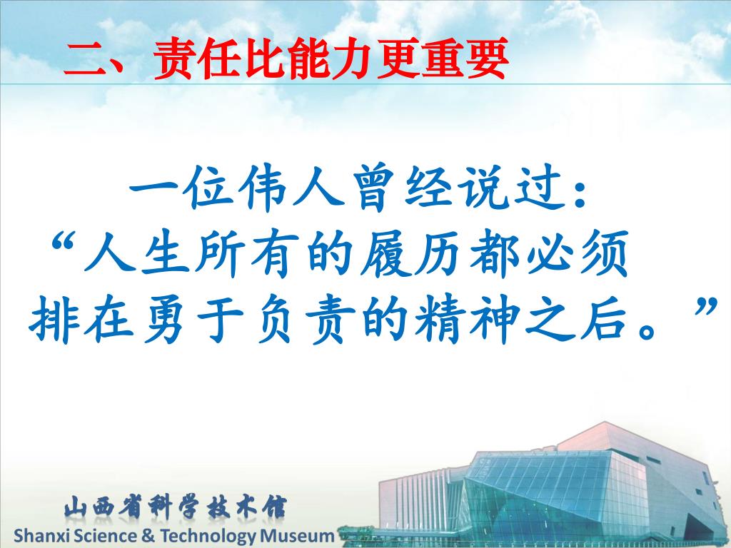二、责任比能力更重要 一位伟人曾经说过:“人生所有的履历都必须 排在勇于负责的精神之后。”