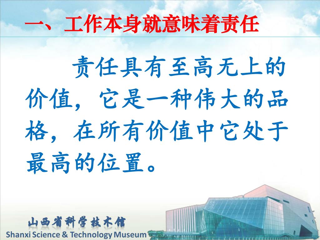 一、工作本身就意味着责任 责任具有至高无上的 价值,它是一种伟大的品 格,在所有价值中它处于 最高的位置。