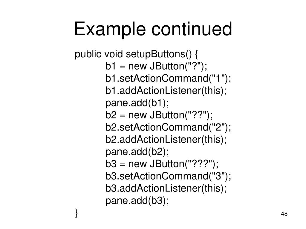 Example continued public void setupButtons() { b1 = new JButton("?"); b1.setActionCommand("1"); b1.addActionListener(this); pane.add(b1); b2 = new JButton("??"); b2.setActionCommand("2"); b2.addActionListener(this); pane.add(b2); b3 = new JButton("???"); b3.setActionCommand("3"); b3.addActionListener(this); pane.add(b3);}