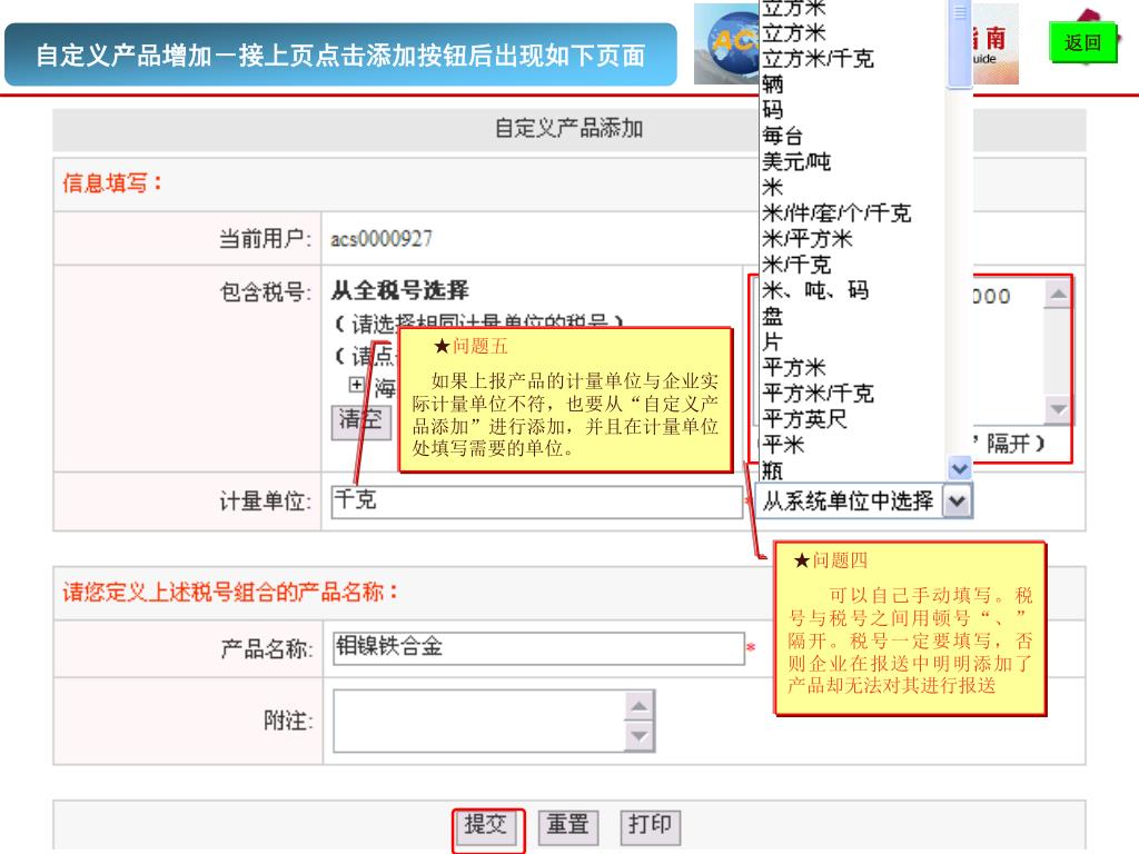自定义产品增加-接上页点击添加按钮后出现如下页面自定义产品增加-接上页点击添加按钮后出现如下页面 返回 ★问题五 如果上报产品的计量单位与企业实际计量单位不符,也要从“自定义产品添加”进行添加,并且在计量单位处填写需要的单位。 ★问题四 可以自己手动填写。税号与税号之间用顿号“、”隔开。税号一定要填写,否则企业在报送中明明添加了产品却无法对其进行报送