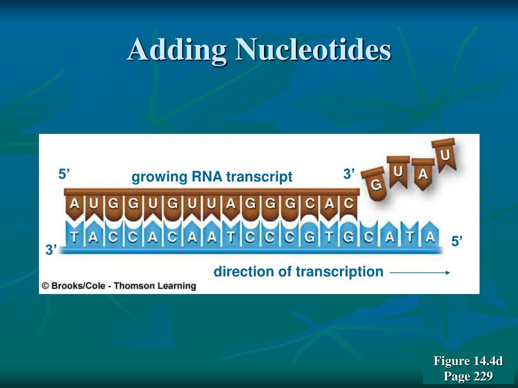 Adding Nucleotides 5’ 3’ growing RNA transcript 5’ 3’ direction of transcription Figure 14.4dPage 229