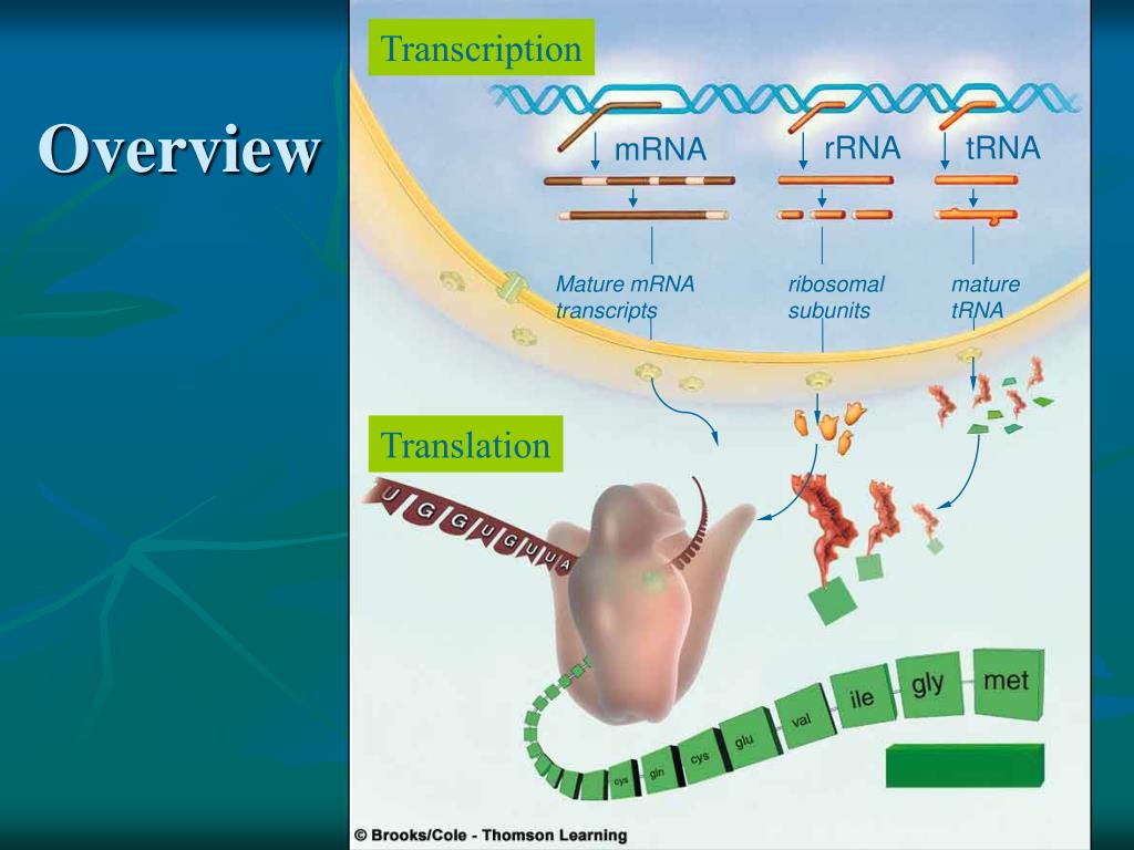 Transcription Overview rRNA tRNA mRNA Mature mRNA transcripts ribosomal subunits mature tRNA Translation