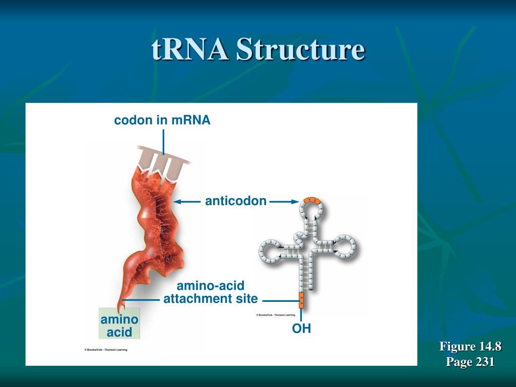 tRNA Structure codon in mRNA anticodon amino-acid attachment site amino acid OH Figure 14.8Page 231