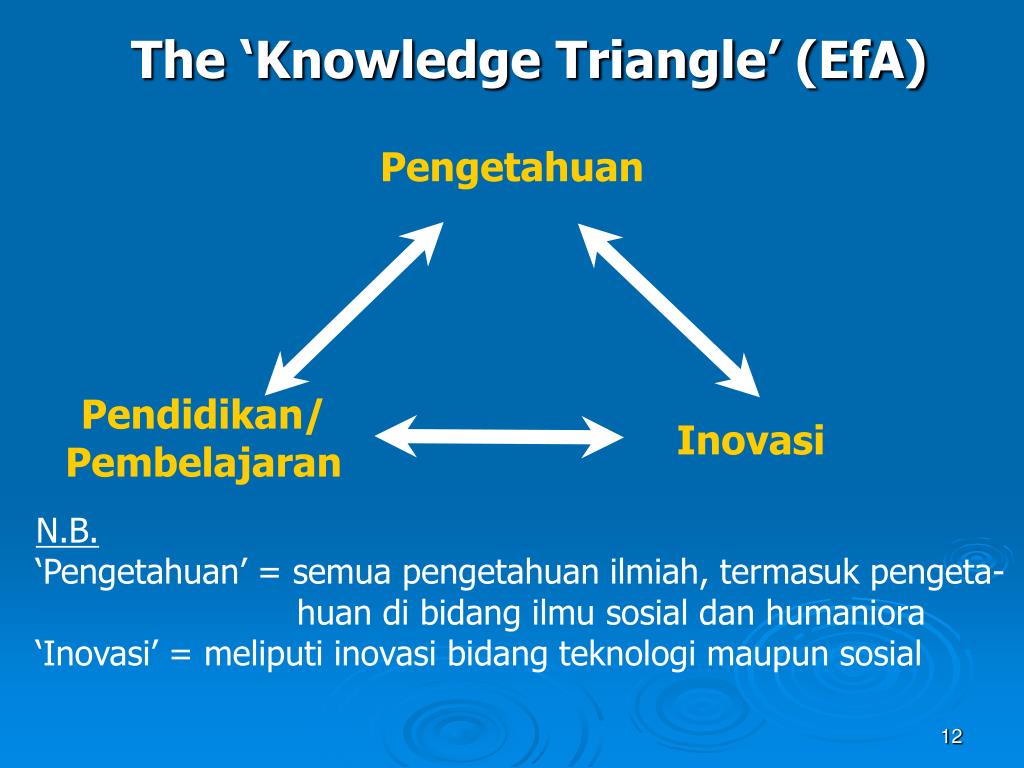The ‘Knowledge Triangle’ (EfA) Pengetahuan Pendidikan/ Pembelajaran Inovasi N.B. ‘Pengetahuan’ = semua pengetahuan ilmiah, termasuk pengeta-huan di bidang ilmu sosial dan humaniora ‘Inovasi’ = meliputi inovasi bidang teknologi maupun sosial
