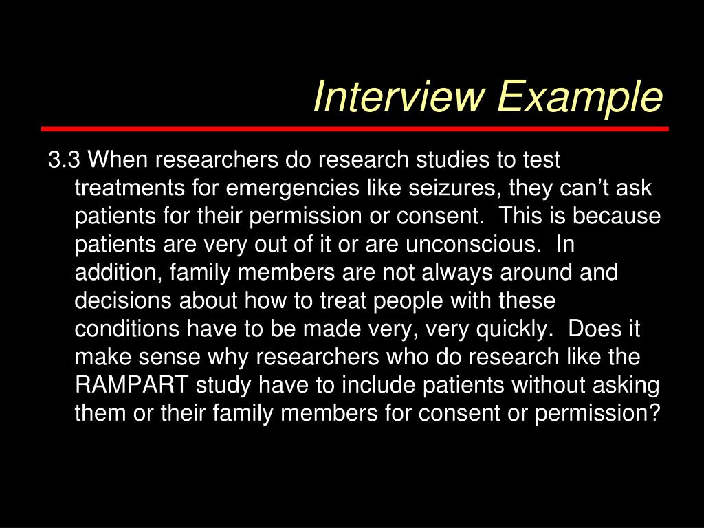 Interview Example 3.3 When researchers do research studies to test treatments for emergencies like seizures, they can’t ask patients for their permission or consent. This is because patients are very out of it or are unconscious. In addition, family members are not always around and decisions about how to treat people with these conditions have to be made very, very quickly. Does it make sense why researchers who do research like the RAMPART study have to include patients without asking them or their family members for consent or permission?