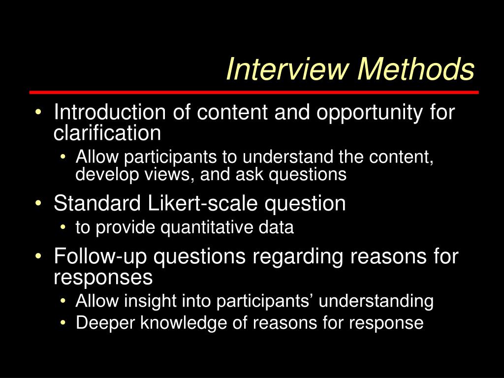 Interview Methods Structured, interactive interviews Principal goals Quantitatively meaningful data with reliable estimates of prevalence of particular views and concerns Qualitative assessment of reasons for responses and level of understanding