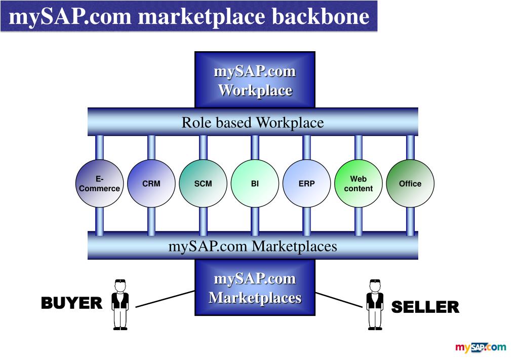 mySAP.com marketplace backbone mySAP.com Workplace Role based Workplace E- Commerce CRM SCM BI ERP Web content Office mySAP.com Marketplaces mySAP.com Marketplaces BUYER SELLER