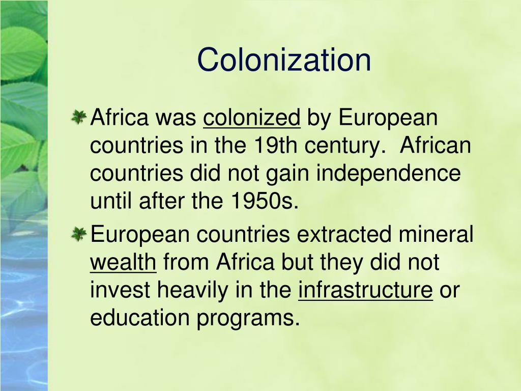Colonization • Africa was colonized by European countries in the 19th century. African countries did not gain independence until after the 1950s. • European countries extracted mineral wealth from Africa but they did not invest heavily in the infrastructure or education programs.