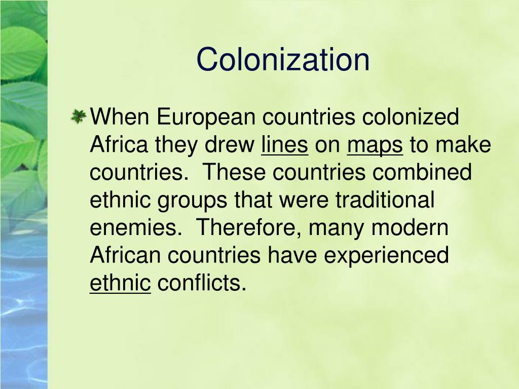 Colonization • When European countries colonized Africa they drew lines on maps to make countries. These countries combined ethnic groups that were traditional enemies. Therefore, many modern African countries have experienced ethnic conflicts.