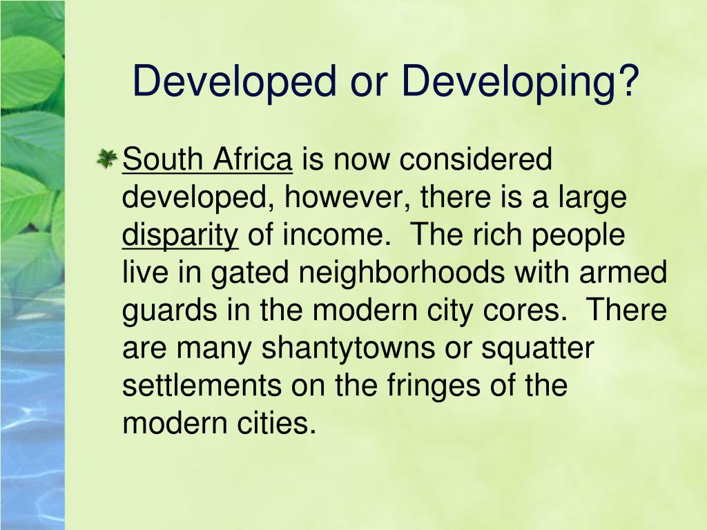 Developed or Developing? • South Africa is now considered developed, however, there is a large disparity of income. The rich people live in gated neighborhoods with armed guards in the modern city cores. There are many shantytowns or squatter settlements on the fringes of the modern cities.