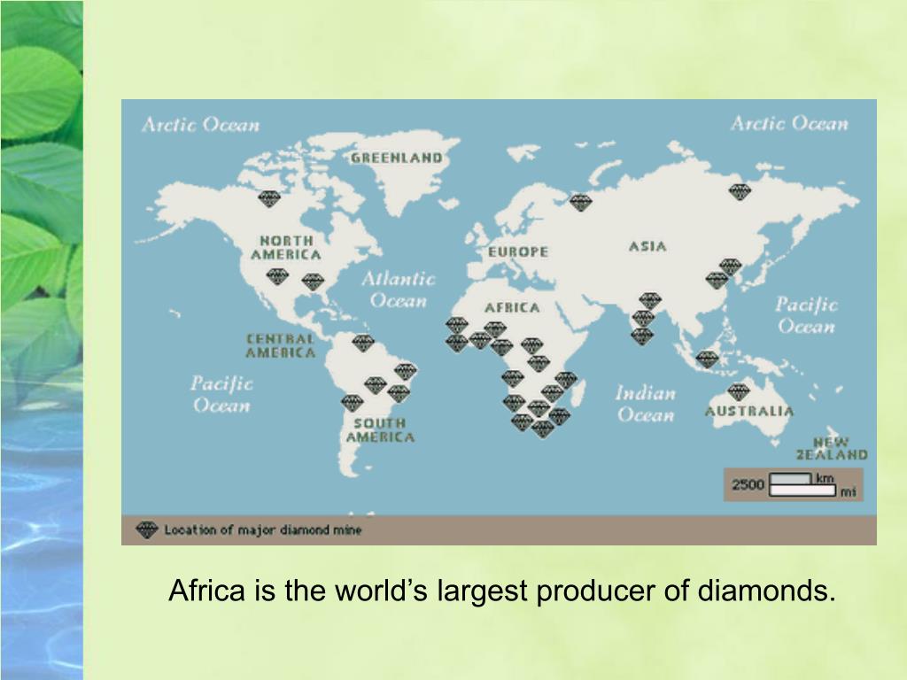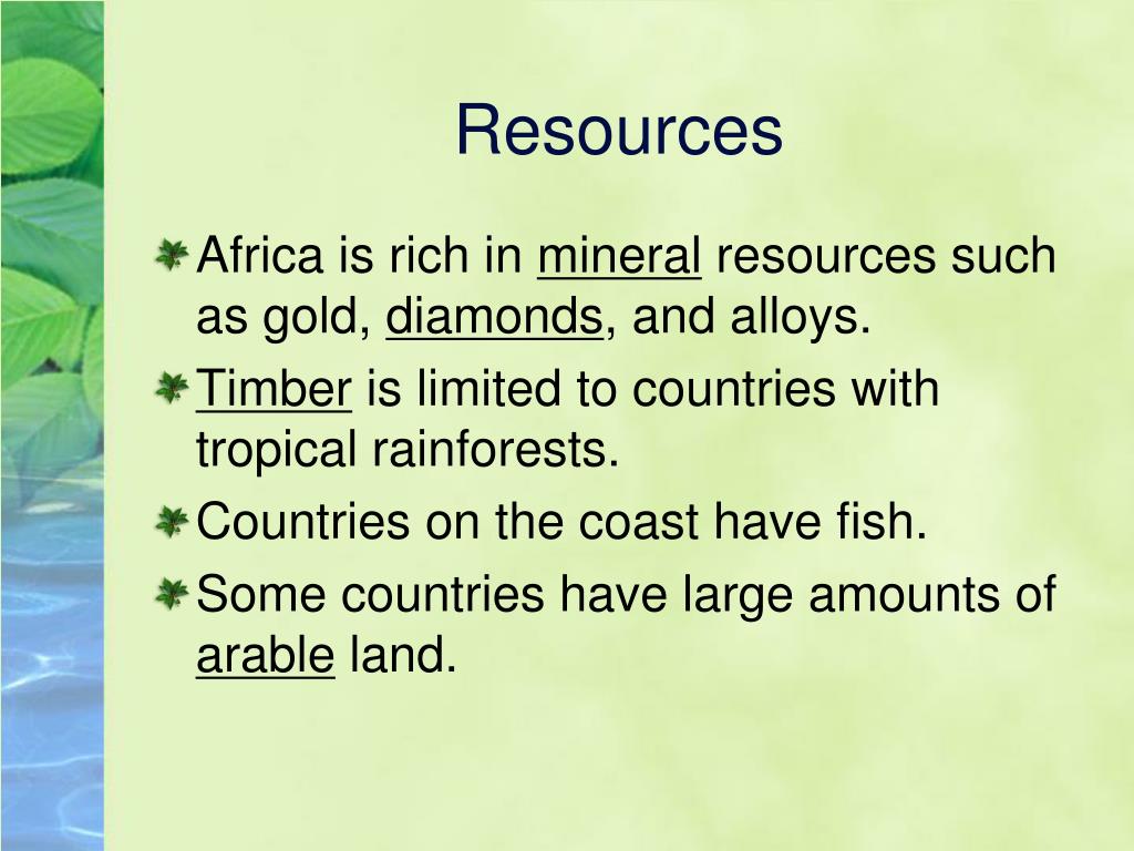 Resources • Africa is rich in mineral resources such as gold, diamonds, and alloys. • Timber is limited to countries with tropical rainforests. • Countries on the coast have fish. • Some countries have large amounts of arable land.