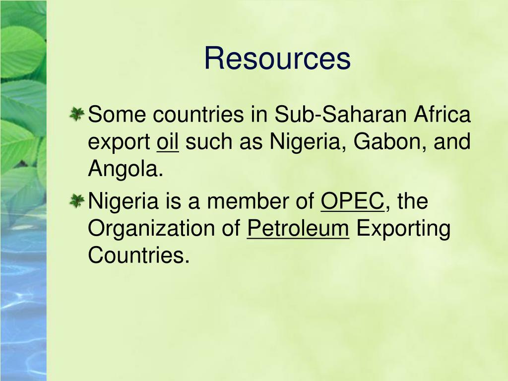 Resources • Some countries in Sub-Saharan Africa export oil such as Nigeria, Gabon, and Angola. • Nigeria is a member of OPEC, the Organization of Petroleum Exporting Countries.