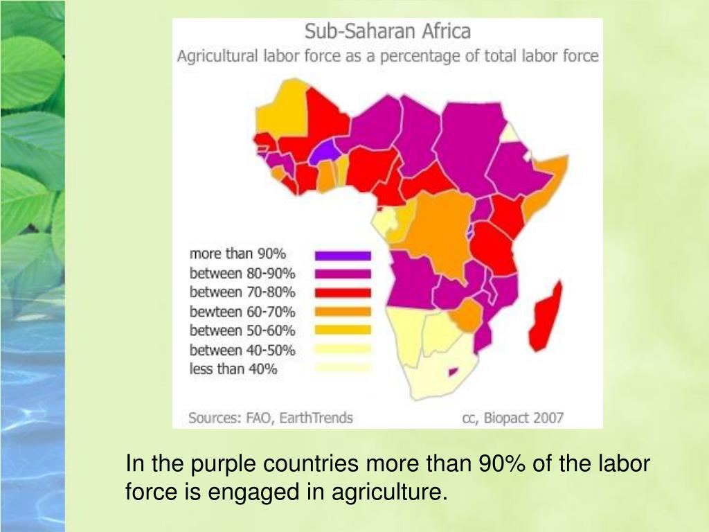 In the purple countries more than 90% of the labor force is engaged in agriculture.