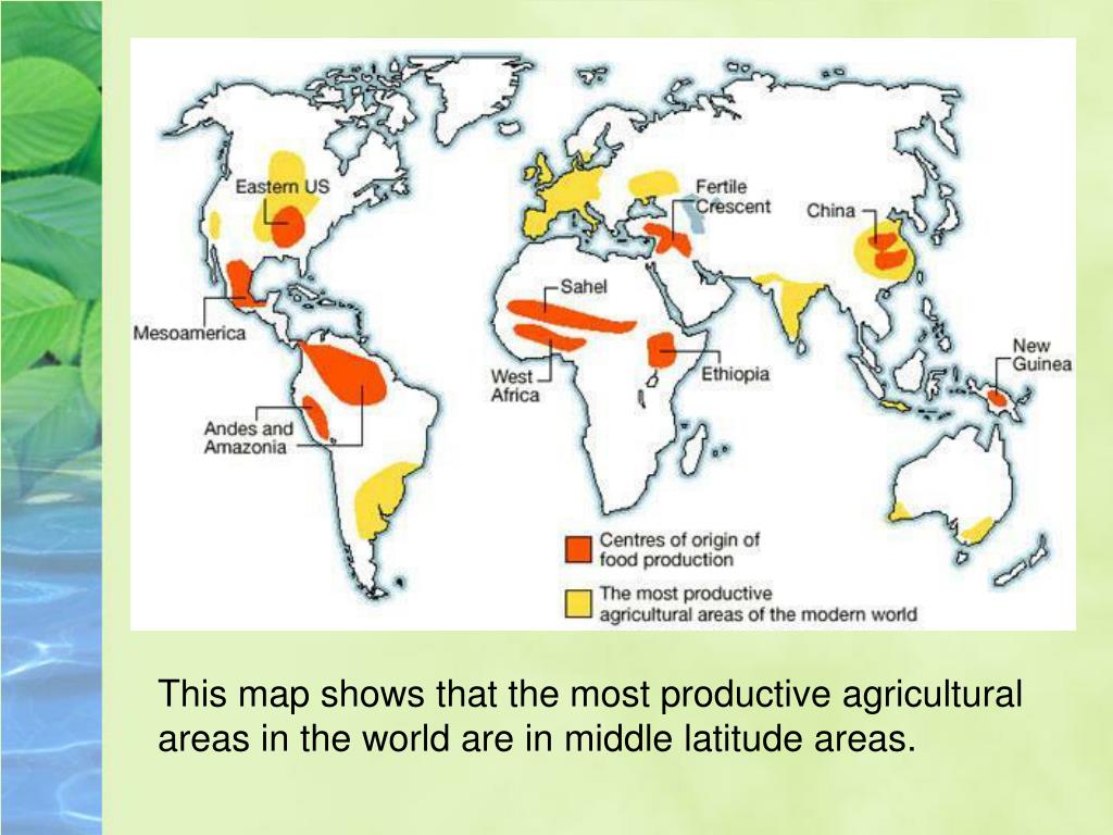 This map shows that the most productive agricultural areas in the world are in middle latitude areas.