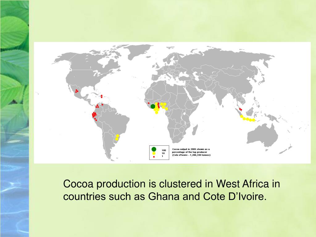 Cocoa production is clustered in West Africa in countries such as Ghana and Cote D’Ivoire.