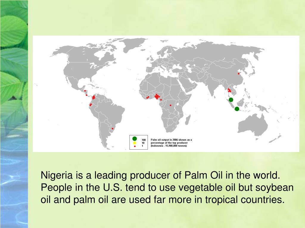 Nigeria is a leading producer of Palm Oil in the world. People in the U.S. tend to use vegetable oil but soybean oil and palm oil are used far more in tropical countries.