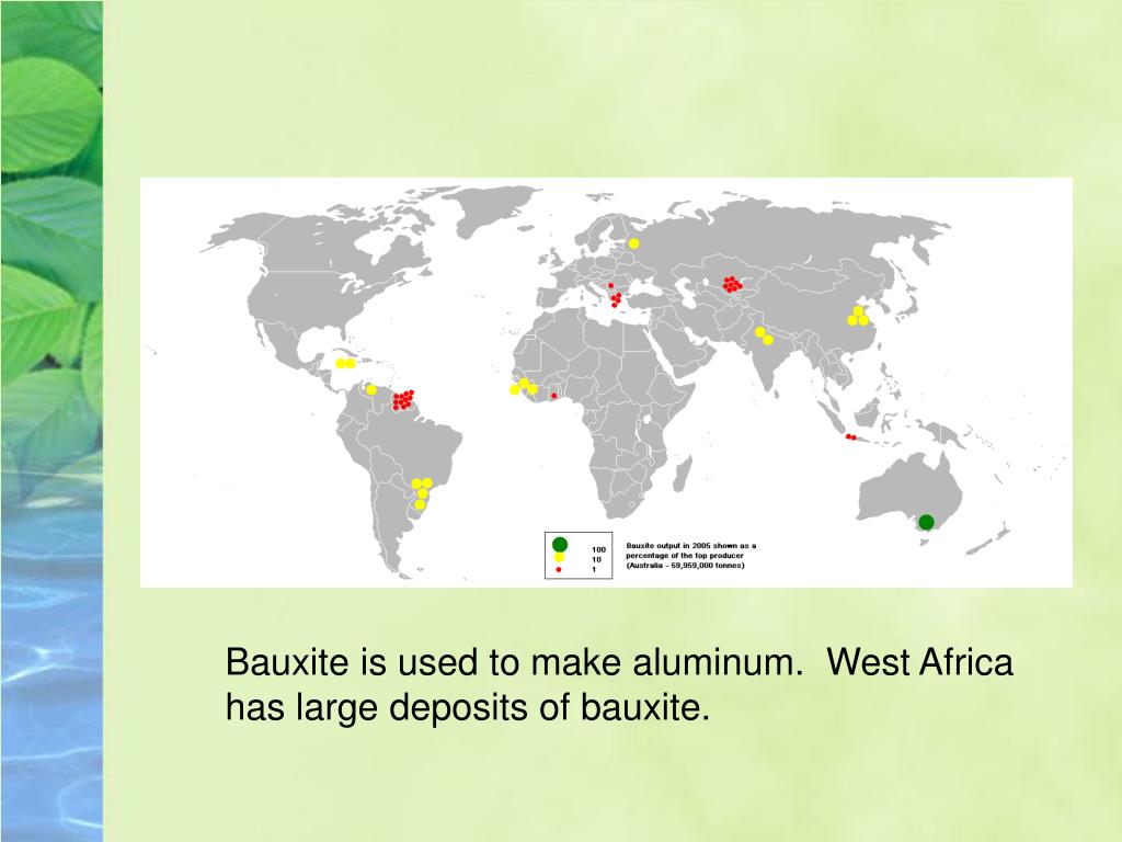 Bauxite is used to make aluminum. West Africa has large deposits of bauxite.