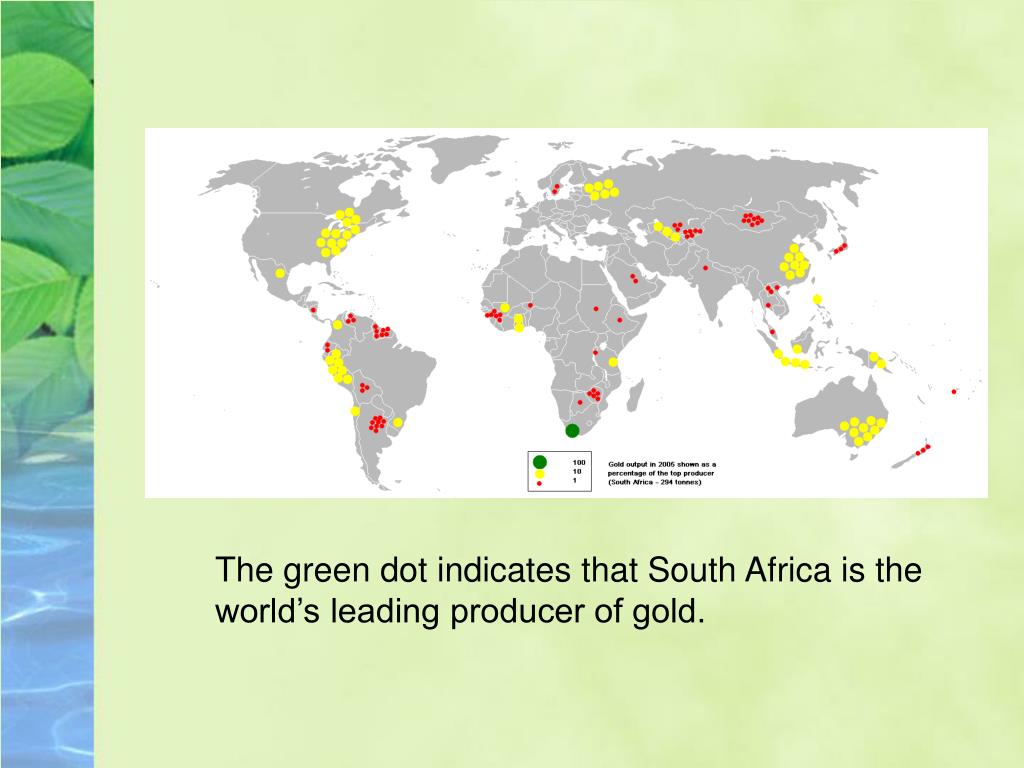 The green dot indicates that South Africa is the world’s leading producer of gold.