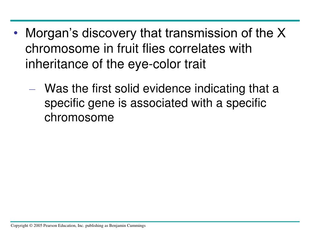 Morgan’s discovery that transmission of the X chromosome in fruit flies correlates with inheritance of the eye-color trait • Was the first solid evidence indicating that a specific gene is associated with a specific chromosome