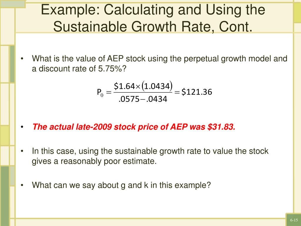 Example: Calculating and Using the Sustainable Growth Rate, Cont. What is the value of AEP stock using the perpetual growth model and a discount rate of 5.75%? The actual late-2009 stock price of AEP was $31.83. In this case, using the sustainable growth rate to value the stock gives a reasonably poor estimate. What can we say about g and k in this example?