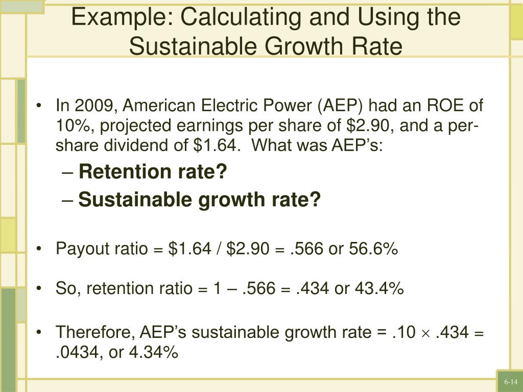 Example: Calculating and Using the Sustainable Growth Rate In 2009, American Electric Power (AEP) had an ROE of 10%, projected earnings per share of $2.90, and a per-share dividend of $1.64. What was AEP’s: Retention rate? Sustainable growth rate? Payout ratio = $1.64 / $2.90 = .566 or 56.6% So, retention ratio = 1 – .566 = .434 or 43.4% Therefore, AEP’s sustainable growth rate = .10 .434 = .0434, or 4.34%