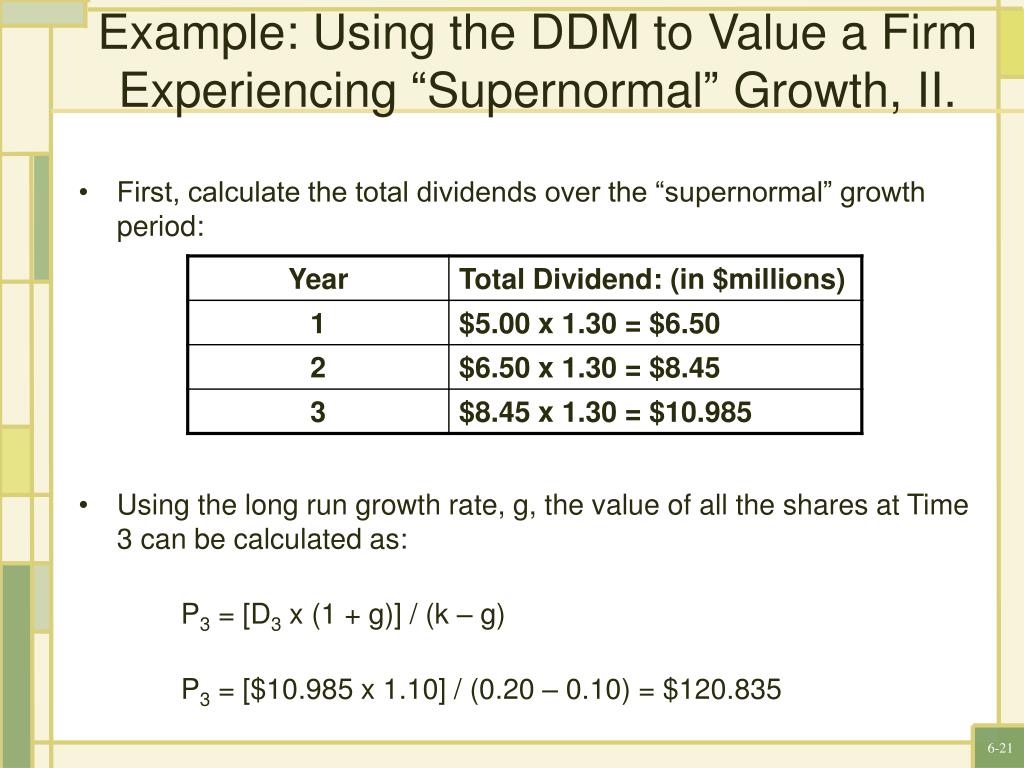 Example: Using the DDM to Value a Firm Experiencing “Supernormal” Growth, II. First, calculate the total dividends over the “supernormal” growth period: Using the long run growth rate, g, the value of all the shares at Time 3 can be calculated as: P3 = [D3 x (1 + g)] / (k – g) P3 = [$10.985 x 1.10] / (0.20 – 0.10) = $120.835