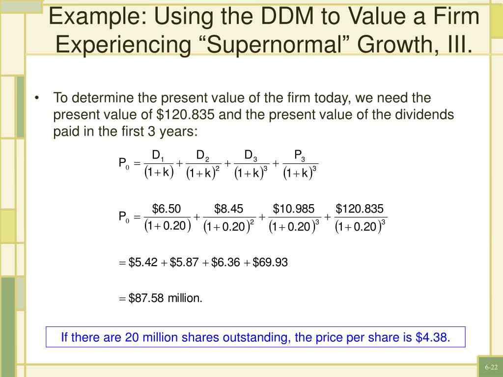 Example: Using the DDM to Value a Firm Experiencing “Supernormal” Growth, III. To determine the present value of the firm today, we need the present value of $120.835 and the present value of the dividends paid in the first 3 years: If there are 20 million shares outstanding, the price per share is $4.38.
