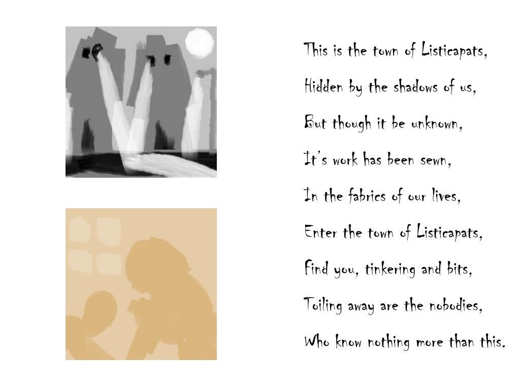 This is the town of Listicapats, Hidden by the shadows of us, But though it be unknown, It’s work has been sewn, In the fabrics of our lives, Enter the town of Listicapats, Find you, tinkering and bits, Toiling away are the nobodies, Who know nothing more than this.
