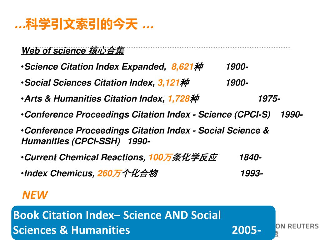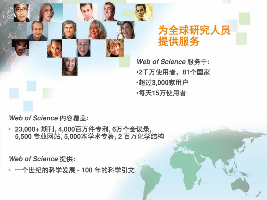 为全球研究人员提供服务 Web of Science内容覆盖: 23,000+ 期刊, 4,000百万件专利, 6万个会议录, 5,500 专业网站, 5,000本学术专著, 2 百万化学结构 Web of Science提供: 一个世纪的科学发展 - 100 年的科学引文 • Web of Science服务于: • 2千万使用者,81个国家 • 超过3,000家用户 • 每天15万使用者